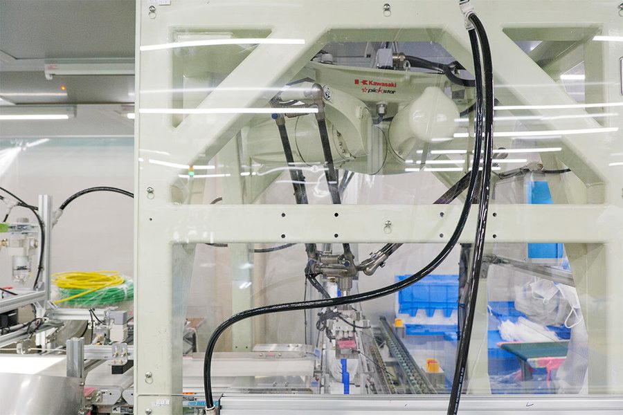 川崎重工的高速分拣机器人“Y系列”也24小时活跃在这条生产线上,搬运所需的人员也从10人减至1人。为生产合理化做出了较大贡献。并联式机器人的特点是可以运用像夹娃娃游戏机一样纤细的机械臂,快速准确地进行搬运,多用于食品行业。也适合要求速度和准确性的口罩生产。